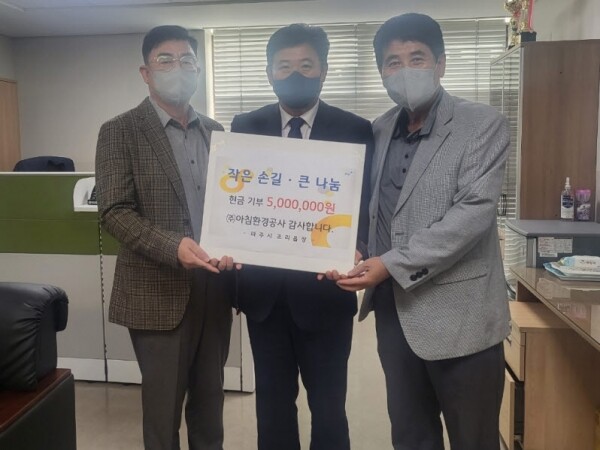 파주시 조리읍 소재 ㈜아침환경공사에서는 성금 500만원을 기탁했으며 김영철 ㈜아침환경공사 대표는 “매년 어려운 이웃을 도와줄 수 있어 감사함을 느낀다”며 “앞으로도 지역사회 발전과 기부문화 확산을 위해 노력하겠다”고 말했다.