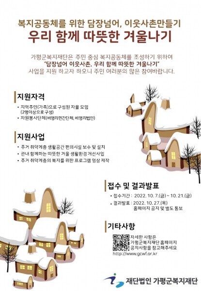 가평군복지재단은 담장넘어, 이웃사촌만들기 사업을 통해 가평 주민주도의 돌봄체계가 활성화되어 주민 중심의 사회안전망을 구축하는데 기여하는 재단이 될 것이라고 밝혔다.