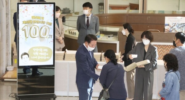 최 시장은 ‘그동안 수고 많았다’, ‘감사한다’, ‘중단 없는 안양 발전에 역량을 모아주세요’ 등 민선 8기 취임 100일의 소회와 감사를 직원에게 전했다.