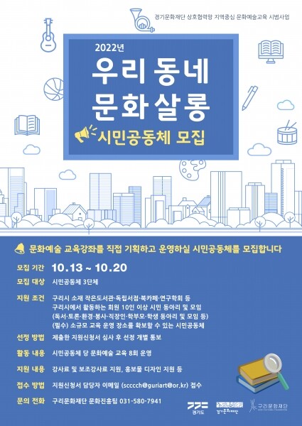 경기도와 경기문화재단, 그리고 구리문화재단이 함께 추진하는 이번 사업은 최종 선정된 시민공동체가 자체 회의를 통해 문화예술 강좌의 주제·일시·강사·장소 등을 정하고 운영과 홍보 또한 스스로 추진하는 진정한 의미에서의 시민주도형 사업이다.