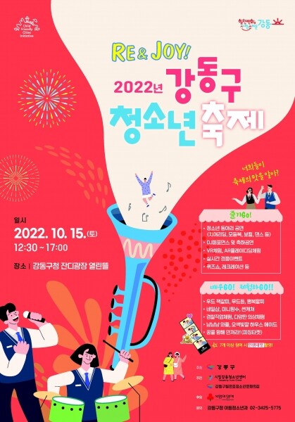 활발한 활동을 이어오고 있는 강동구 아동·청소년참여기구의 활동보고 전시와 포토존도 둘러볼 수 있고 마지막 무대를 화려하게 장식할 DJ 퍼포먼스와 축하공연도 펼쳐져 청소년들이 그간 쌓인 학업 스트레스를 해소하며 함께 즐길 수 있는 축제가 될 것으로 기대하고 있다.