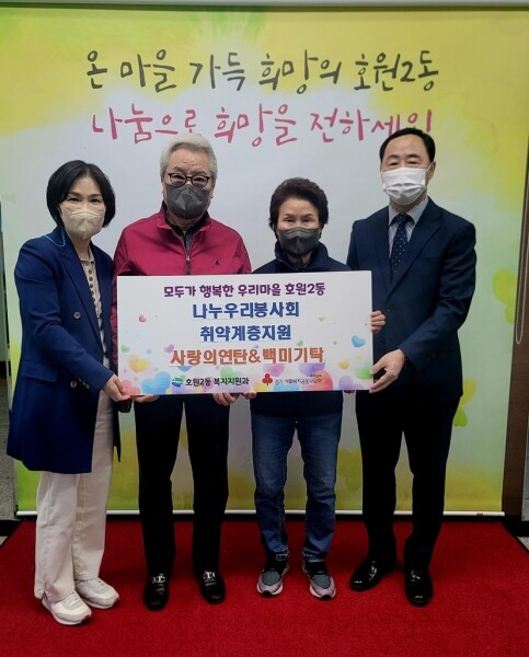 김영리 호원2동 복지지원과장은 “우리 이웃들에게 지속적으로 따뜻한 관심을 기울이는 나누우리 봉사회에 감사드리며 호원2동에 따뜻한 나눔의 정이 계속해서 이어지기를 바란다”고 밝혔다.
