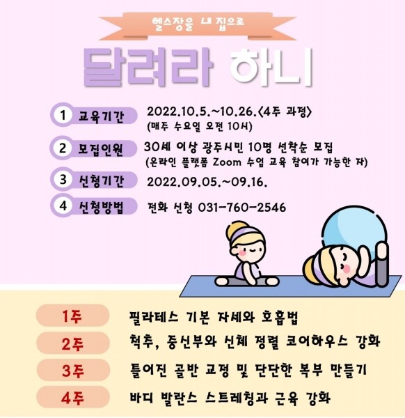 비대면 방식으로 진행되는 ‘달려라 하니’는 30세 이상 광주시민 10명을 대상으로 매주 수요일 오전 10시부터 50분간 운영되며 전문적인 트레이너의 교육을 통해 올바른 근육 사용법 및 틀어진 몸을 바로 잡을 수 있는 건강한 자세를 익혀 생활 속에서 지속적으로 활용할 수 있는 운동 습관을 만드는 데 초점을 맞춰 진행한다.
