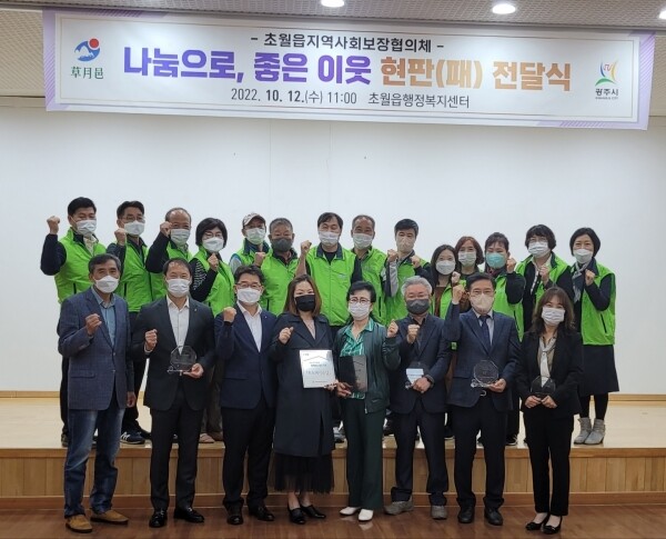 좋은 이웃 현판 전달식은 3년 이상 지속적으로 이웃을 위해 후원한 초월농협, ㈜대진피엔씨, ㈜삼호, ㈜힐링, ㈜세용기전, ㈜일동금망, 한누리전원교회, 한빛중앙교회, 하나님의교회 세계복음선교협회 9개소 단체와 초월읍 협의체 특화사업인 ‘젊어진day’ 사업에 이·미용 재능기부로 동참한 다움샆, 도도헤어클럽, EG헤어# 미용실 등 3개소에 감사패와 현판을 전달했다.