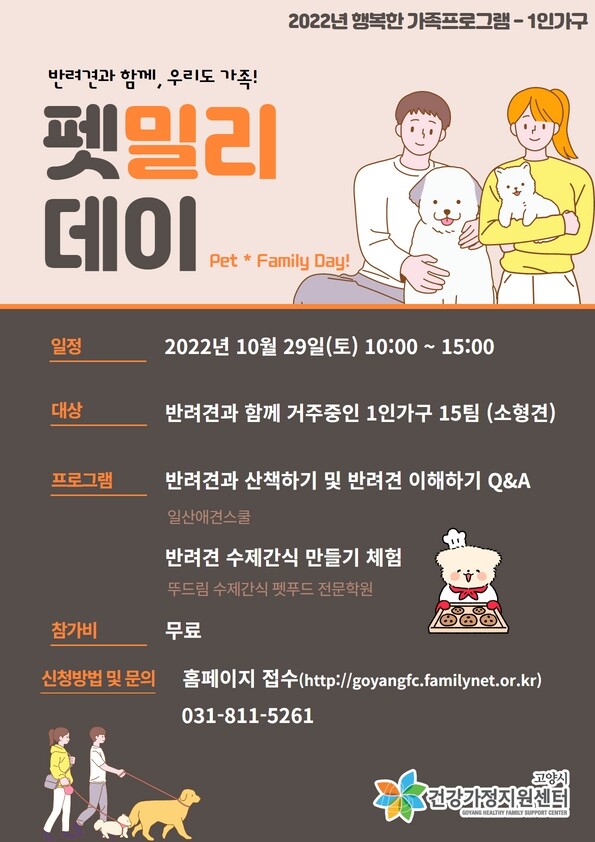 펫밀리데이에는 고양시에서 반려견을 키우거나 키울 예정인 1인가구 15팀이 참가할 수 있다.