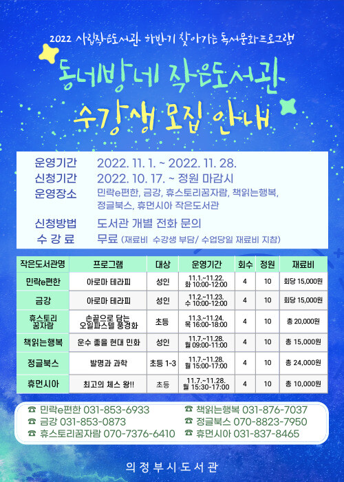 참여 신청은 10월 17일부터 사립작은도서관별 직접 방문 및 전화 접수를 통해 가능하며 기타 궁금한 사항은 사립도서관으로 문의하면 된다.