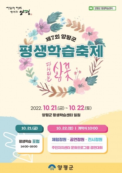 관내 평생학습 기관·단체, 학습동아리, 꿈의학교 등이 참여해 평생학습으로 하나 되는 축제의 장이 될 이번 행사는 21일에 ‘행복을 담은 양평, 평생학습에서 답을 찾다’라는 주제로 평생학습센터 4층 온누리실에서 오후 2시부터 평생학습 포럼이 진행되며 22일에는 축제 개막식과 함께 학습자들이 그동안 학습으로 성장한 성과물을 전시·공연·체험으로 만나볼 수 있다.
