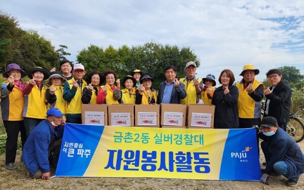 이날 행사에는 금촌2동 직원 및 실버경찰대 대원 30명이 참석해 고구마 10kg, 16박스를 수확했으며 수확한 고구마는 판매를 거쳐 연말 이웃돕기 모금으로 기부될 예정이다.