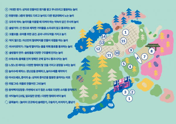여러 상자를 가지고 결합해 움직이는 미로를 제작하는 ‘어서오세요, 종이의 숲’ 물이 나오는 구조물을 뛰거나 점프해서 피해 다니는 ‘비 사이로 막 가’ 종이상자로 하는 ‘거대한 젠가’ 장난감을 분해하고 조립하는 ‘놀이 수레 제작소’ 등이다.