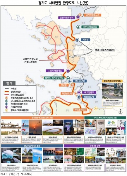 이에 연구원은 비대면 시대, 관광도로 도입으로 지역관광의 매개체 역할로 서해안권 테마형 관광도로 명소화 추진전략으로 도로의 문화·관광적 기능을 강화하고 지역경제 기여도를 높일 수 있는 정책 방향으로 관광도로의 지정을 위한 법제화 관광도로에 대한 정의 규정 신설, 우리나라 실정에 맞는 관광도로 지정 및 관리기준 마련 관광도로 10선 선정, 스마트 복합쉼터 사업 확대 등 최근 여건 변화에 대응한 사업 발굴 서해안권을 관통하는 경기도 테마형 관광도로 추진 등을 제시했다.