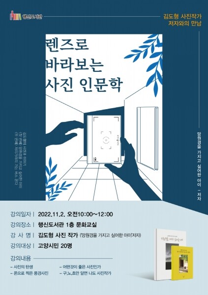 행신도서관 담당자는 “사진은 단순한 기록에서 나를 표현하는 수단으로 발전했다 사진가이자 사진 인문학자인 김도형 작가와의 만남을 통해 좋은 사진을 찍는 실용적인 방법을 배우고 인문학적 소양도 키우는 좋은 기회가 될 것”이라고 말했다.