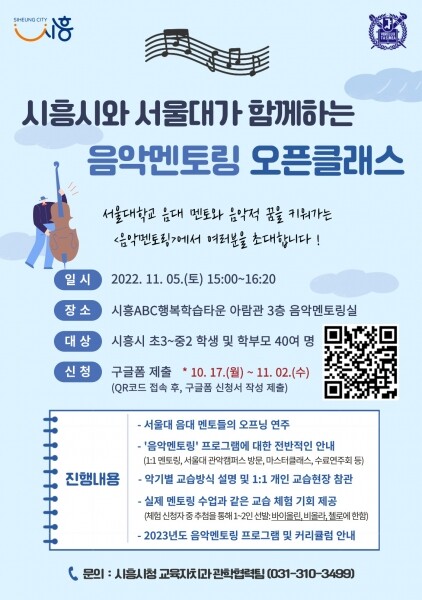 임병택 시흥시장은 “서울대 음대생의 멘토링을 통해 음악적 소양과 문화에 대한 이해력을 높일 수 있을 뿐 아니라, 합주를 통해 ‘함께하는 공동체 의식’의 인성교육을 함께 경험할 수 있는 서울대와의 특화된 예술교육 프로그램에 많은 시흥 학생들의 참여를 기대한다”고 전했다.