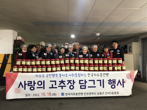 한편 자유총연맹 간석3동 분회는 매년 사랑의 고추장 담그기 행사뿐만 아니라 결연된 지역 내 경로당에서 환경정비 봉사 및 간식 후원 등 지역 내 어려운 이웃과 어르신들의 복리를 위해 지속적인 봉사활동을 펼쳐오고 있다.