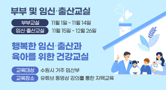 자세한 내용은 수원시 보건소 홈페이지 ‘보건소식’에 게시된 ‘행복한 임신·출산과 육아를 위한 건강교실 안내’에서 볼 수 있다.