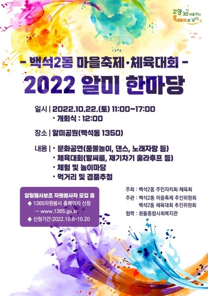 남신현 백석2동 마을축제 추진위원장과 여미경 백석2동 체육대회 추진위원장은 “오랜만에 개최하는 마을축제와 체육대회인 만큼 다들 즐거운 마음으로 참석해 주민 화합과 어울림의 장이 되도록 많이 구경하러 오시길 바란다”고 말했다.
