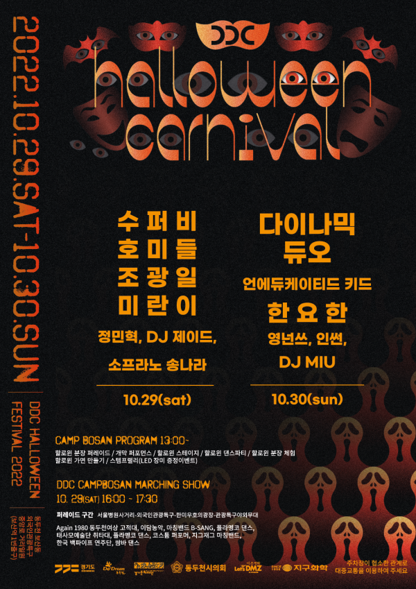 축제의 메인 이벤트인 할로윈 힙합 콘서트에는 한국 힙합의 전설인 ‘다이나믹 듀오’와 쇼미더머니 10 우승자인 ‘조광일’을 비롯해 ‘슈퍼비’, ‘호미들’, ‘한요한’ 등 국내 최정상급 래퍼들이 다수 출연한다.
