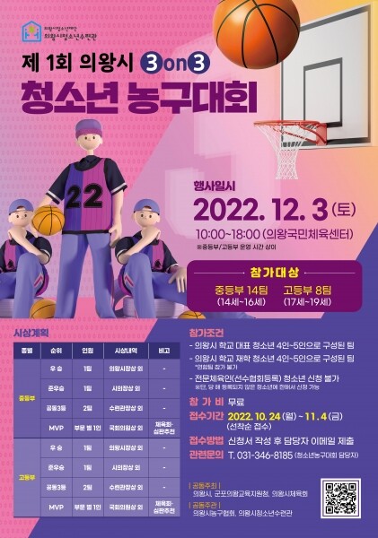 이번 청소년농구대회는 의왕시, 군포의왕교육지원청, 의왕시청소년재단이 공동주최하고 의왕시체육회와 의왕시청소년수련관이 공동주관해 그간 위축되어 있던 청소년 스포츠 활동에 활력을 불어넣기 위해 마련했다.