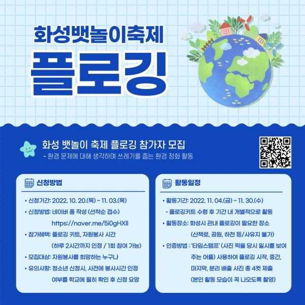 이번에 모집하는 ’플로깅‘은 누구나 참여할 수 있으며 오는 30일까지 화성 뱃놀이 축제 누리집을 통해 선착순 200명까지 신청 가능하다.