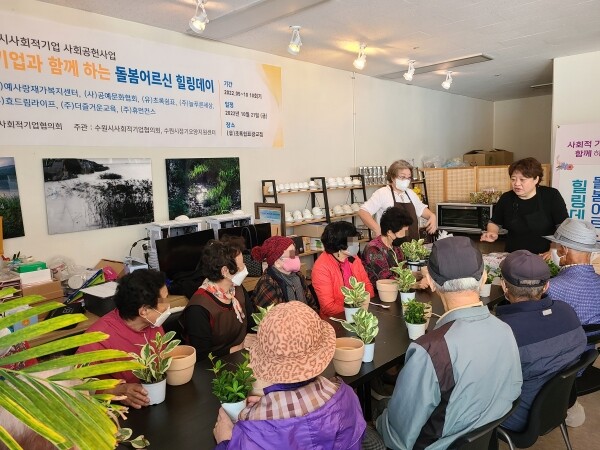 수원시사회적기업협의회 소속 사회적기업 7개소공예문화협회·초록쉼표· ㈜늘푸른세상·㈜효드림라이프·㈜더즐거운교육·㈜휴먼컨스)가 참여해 돌봄 어르신을 위한 정서 안정 프로그램, 웰 다잉 교육, 원예 힐링 교육 등 다채로운 프로그램을 제공했다.