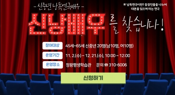 이번 프로그램은 45세부터 65세 신중년을 대상으로 진행되며 연극과 책을 활용한 ‘신나는 신낭배우’, ‘책 골라드립니다.