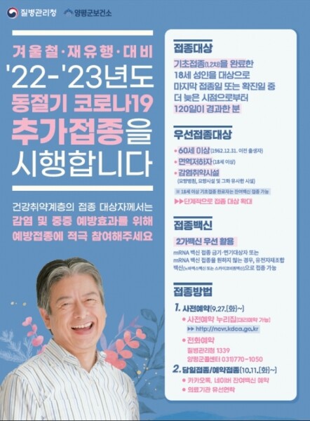 전진선 군수는 “겨울철 재유행을 대비하고 코로나19 감염으로부터 건강피해를 최소화하기 위해 2가 백신을 활용한 동절기 추가접종에 군민 여러분의 많은 관심과 참여를 바란다‘라고 전했다.