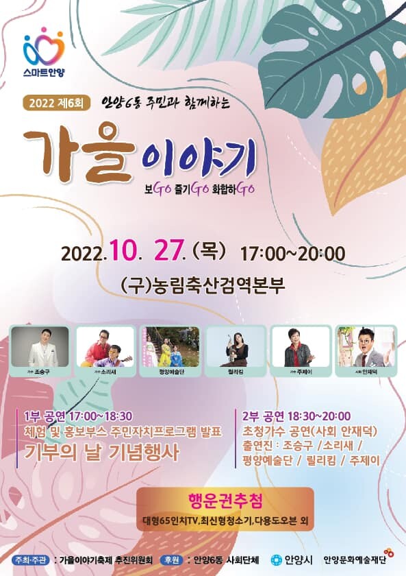 5시부터 열리는 1부 공연에서는 노래교실, 통기타 연주, 약봉테라피 등 안양6동 주민자치센터 프로그램 수강생들이 그동안 갈고닦은 실력을 뽐낼 예정이며 2부 공연에서는 개그맨 안재덕의 사회로 조승구, 소리새, 평양예술단, 릴리킴, 주제이 등 초청 가수의 무대가 이어진다.