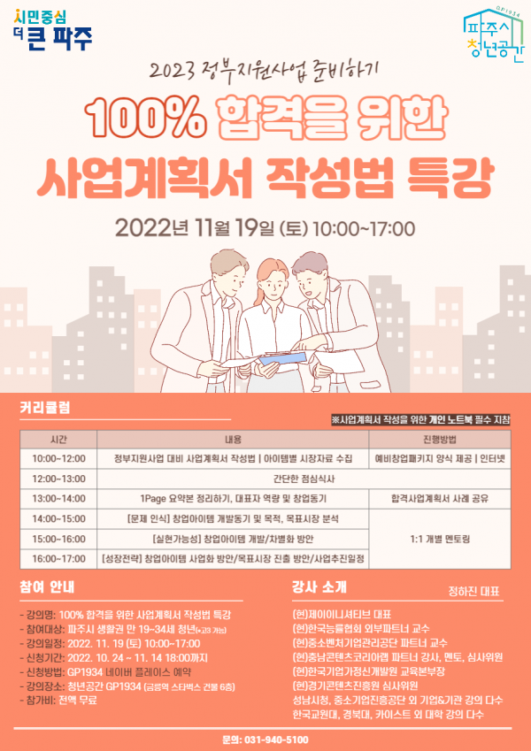 참여 대상은 파주시가 생활권인 만 19세 이상 34세 이하 청년이며 정부지원사업 대비 사업계획서 작성법 합격사업계획서 사례 공유 창업아이템 개발동기 및 목표시장 분석 창업아이템 개발 및 차별화 방안 등의 주제로 진행된다.