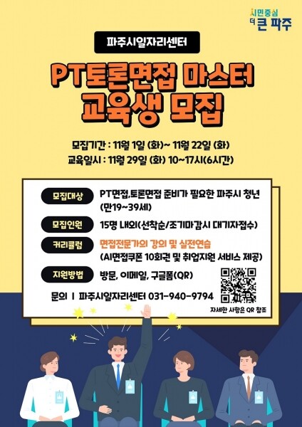 프로그램은 11월 29일 10시부터 오후 5시까지 파주시일자리센터에서 진행되며 PT면접 직무지식, 자료만들기 A to Z 토론면접 대비, 발언 및 피드백 대응 면접 방식별 상호피드백 & 코칭 등의 내용으로 구성됐다.