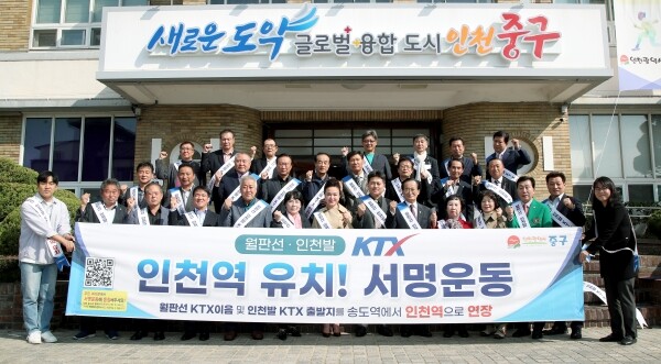 한편 KTX 인천역 유치 서명운동은 9월부터 11월까지 전개되며 구청 민원실 및 동 행정복지센터에 비치된 서명부를 통한 오프라인 서명과 중구청 홈페이지, QR코드를 통해 서명이 가능하다.