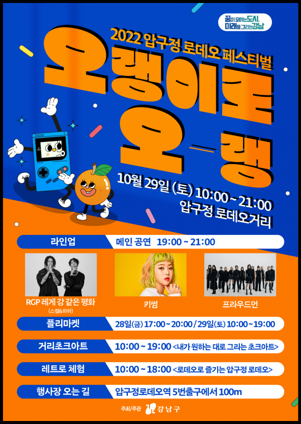 이런 분위기에 맞춰 개최되는 축제 ‘오랭이로 오~랭’은 과거 압구정 ‘오렌지족’을 재미있게 부르는 ‘오랭이’라는 단어를 활용해, 복고 감성을 좋아하는 MZ세대뿐 아니라 가족, 친구, 연인 등이 다시 압구정으로 모인다는 의미를 담아 다양한 이벤트를 마련했다.