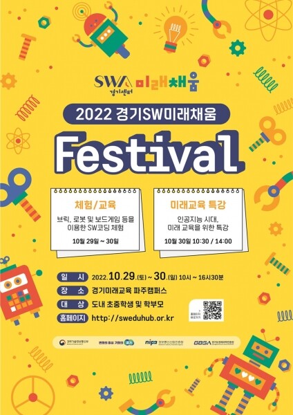 특히 경기도경제과학진흥원과 초등컴퓨팅교사협회 외 소프트웨어 관련 기업·기관과 공동으로 페스티벌을 개최해 브릭을 이용한 미래교실 만들기, 지니봇을 활용한 체스 두기, 햄스터로봇을 활용한 배달 미션 완성하기, 언플러그드 보드게임 등 풍성한 체험 프로그램을 제공할 예정이다.