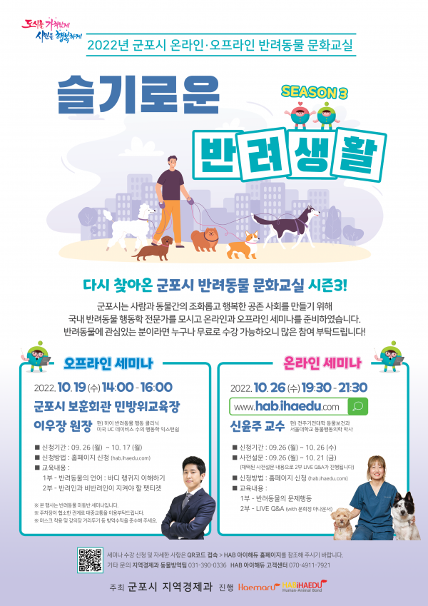 10월 26일 저녁 7시 30분부터 9시 30분까지 hab.ihaedu.com 에서 진행되는 온라인 세미나에서는 신윤주 교수 의 반려동물 문제 행동에 대한 강의와 더불어 LIVE Q&A 시간에는 사전 설문 중 채택된 사연으로 실제 보호자들의 고민 상담과 솔루션을 제공할 예정이다.