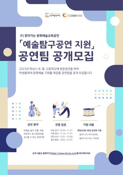 ‘2023 예술탐구공연 지원’은 올해까지 진행되어 온 ‘찾아가는 문화예술교육공연’사업의 새로운 명칭으로 공연팀이 화성시 초·중·고등학교에 방문공연을 해 학생들에게 다양한 문화 체험 기회를 제공하는 사업이다.