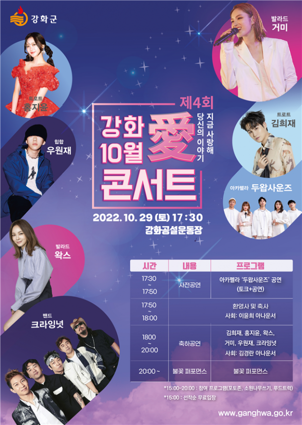 콘서트는 강화군민이면 누구나 무료로 관람 가능하며 당일 오후 3시부터 선착순으로 입장할 수 있다.