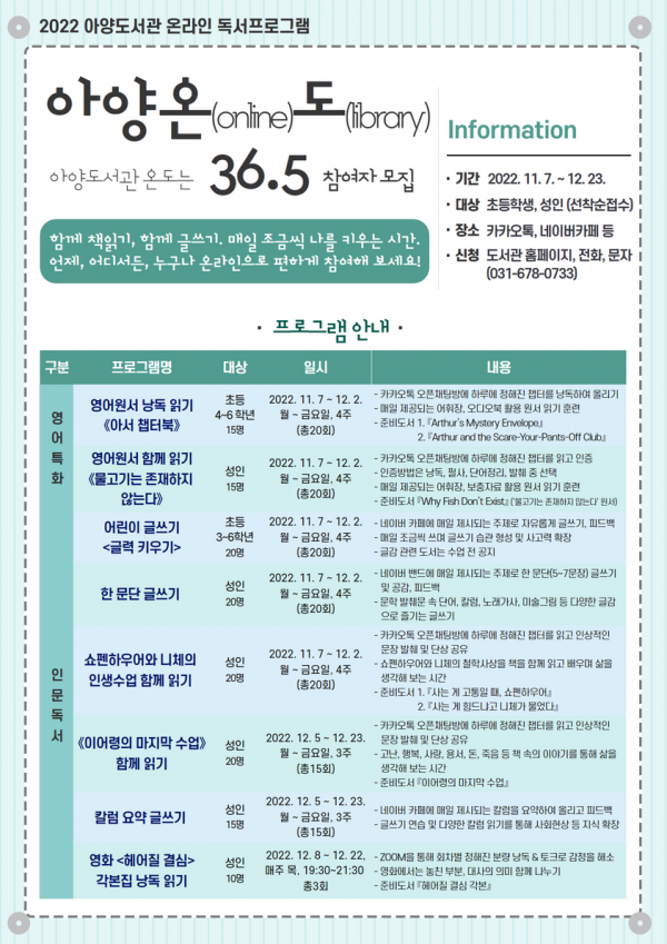 모집 프로그램 중 영어원서 ‘아서 챕터북’ 낭독 읽기 영어원서 ‘물고기는 존재하지 않는다’ 함께 읽기 어린이 글쓰기 한 문단 글쓰기 쇼펜하우어와 니체 함께 읽기 5개 강좌는 11월 7일부터 12월 2일까지 4주간 평일 총 20회 운영되며 ‘이어령의 마지막 수업’ 함께 읽기 칼럼 요약 글쓰기 영화 ‘헤어질 결심’ 각본집 낭독 읽기 3개 강좌는 12월 5일부터 12월 23일까지 3주간 평일 총 15회 운영된다.