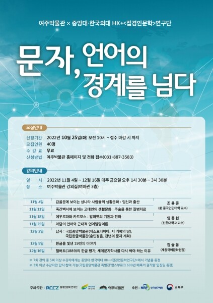 이번 강의는 한자와 알파벳, 한글 등 문자의 역사와 문화를 통해 세계문자학사에서 한글의 우수함을 살펴보기 위해 중앙대·한국외대 HK+‘접경인문학연구단’과 공동으로 기획했다.