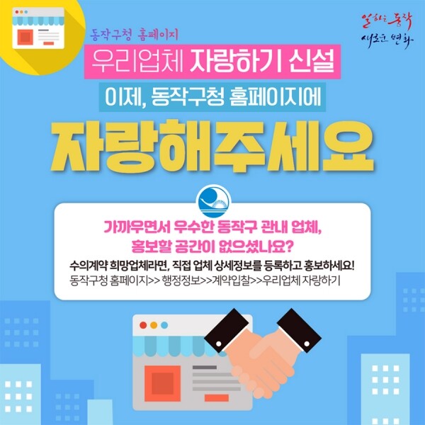 ‘우리업체 자랑하기’는 동작구에서 이뤄지는 각종 계약·구매·입찰 등에 관내 업체를 우선하는 ‘동작 퍼스트’에 대한 박일하 구청장의 의지가 반영된 것으로 지난달 23일 동작구청 누리집 내 신설된 코너다.