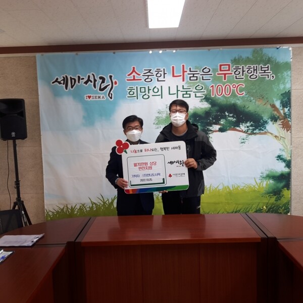 세마동 신동진 동장은 “관내에 결식이 우려되는 저소득 이웃들을 위한 따뜻한 기부를 해주신 서대명 대표님의 노고에 감사드리며 앞으로도 관내 어려운 이웃을 위해 관심가져 주시길 부탁드린다”고 말했다.