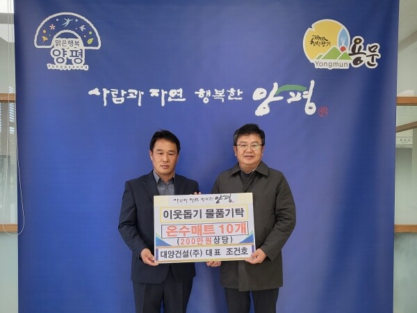㈜대양건설 조건호 대표는 “갑작스럽게 쌀쌀해진 날씨에 어려운 이웃들에게 따뜻하고 편안한 보금자리를 마련해드리고 싶었다”며 “이번 온수매트 나눔을 통해 다가올 겨울을 든든하게 대비하셨으면 한다”고 기부의 소감을 전했다.