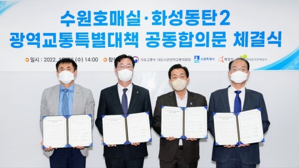 이재준 수원특례시장은 26일 서울 중구 국토발전전시관에서 열린 ‘광역교통 특별대책 관계기관 기관장 회의’에 참석해 이성해 대도시권광역교통위원장, 신경철 LH 국토도시개발본부장, 정명근 화성시장 등과 함께 ‘특별대책 이행 합의문’을 작성했다.