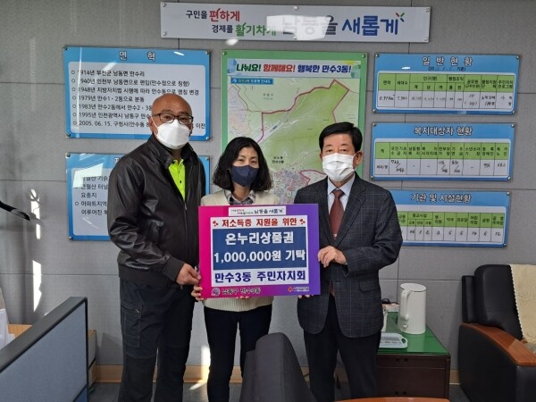 김종수 동장은“매년 지속적으로 이웃사랑을 실천하고 계신 김동환 만수3동 주민자치회장님을 비롯한 주민자치회 위원들께 감사드린다”며 “소중한 관심과 함께 후원해주신 마음을 생각하며 관내 어려운 이웃들이 추운 계절을 따뜻하게 보낼 수 있도록 잘 살피겠다”고 밝혔다.
