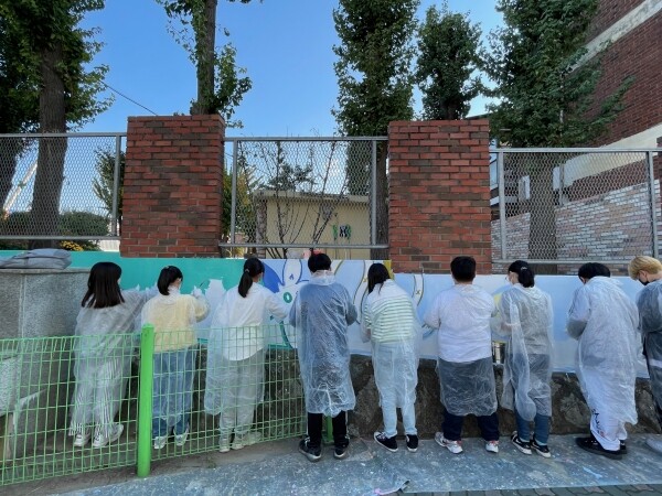 담장벽화 그리기 디자인은 꽃과 도형, 비구상적인 이미지를 담았으며 부개서초 학생 20명이 직접 붓을 들고 페인트를 칠하며 뜻깊은 시간을 보냈다.