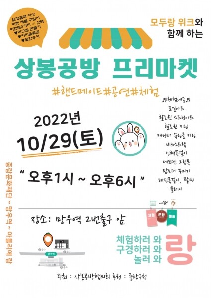 이번 프리마켓은 상봉공방협의체를 비롯한 지역 내 공방 작가 30여명이 주축이 돼 준비한 다채로운 핸드메이드 제품 판매와 공방 체험 프로그램, 중랑아티스트의 공연으로 이루어진다.