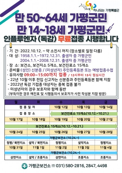가평군보건소장은 “50~64세는 인플루엔자 감염시 합병증 발생이 높은 고위험군이며 14~18세는 집단생활로 인해 인플루엔자 감염에 취약한 점을 고려해 우선접종 대상으로 선정했다”. 또한 어린이와 만 65세 이상 어르신, 임신부는 위탁 병·의원에서 무료 접종을 할 수 있다며 코로나19와 동시에 유행하는 인플루엔자 예방을 위해 적극적인 참여를 당부했다.