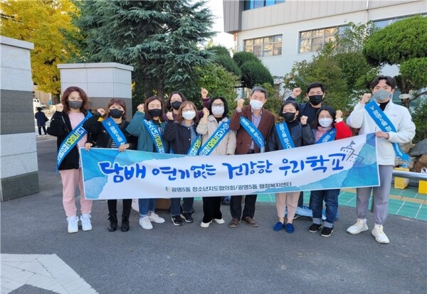 이번 캠페인은 광명5동 청소년지도협의회의 청소년 유해환경개선 사업의 일환으로 광남중학교와 경기남부금연지원센터, 광명시보건소 금연센터 등과 협력해 흡연의 유해성을 홍보하고 금연을 장려하기 위해 진행했다.