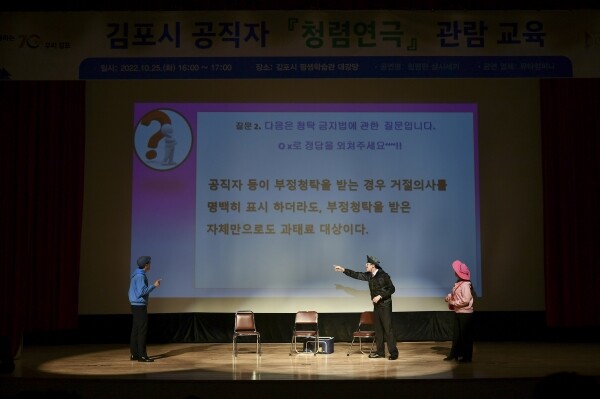 김병수 김포시장은 “청렴이라는 화두는 모든 공직자가 자주 접하지만 이렇게 연극이라는 콘텐츠로 보는 기회는 흔치 않을 것”이라며 “유쾌하지만 뼈가 있는 이번 청렴 연극을 통해 오늘보다 내일 더 청렴한 공직자가 되는데 도움이 되셨으면 좋겠다”고 말했다.