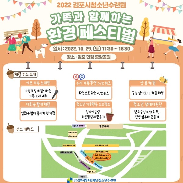 김포시청소년수련원장은 “이번 가족과 함께하는 환경페스티벌은 온 가족이 함께 즐기는 축제의 한마당이 될 것”이라며 “페스티벌을 통해 지역사회의 환경 문제를 돌아보는 시간을 가져보셨으면 좋겠다”고 말했다.