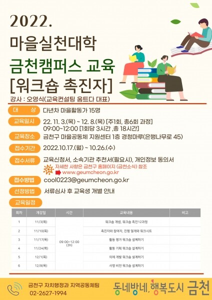 교육은 11월 3일부터 12월 8일까지 워크숍 개념 촉진 원리와 실체 워크숍 설계하기 등 총 6회로 구성했으며 참여자가 6강 중 80% 이상 출석할 경우에는 수료증을 수여할 예정이다.