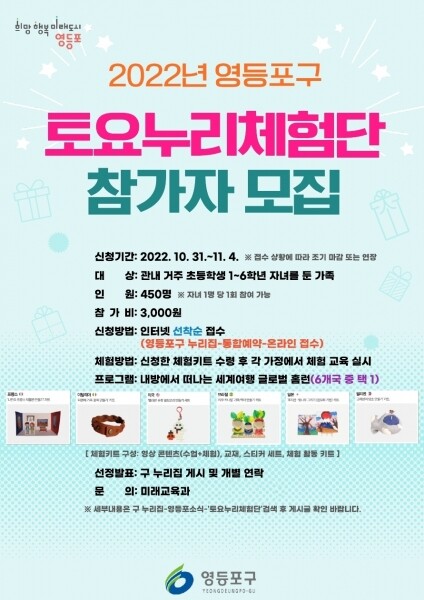 토요누리체험단은 관내 초등학생 1~6학년 자녀를 둔 가족이 신청할 수 있으며 오는 10월 31일부터 영등포구청 홈페이지의 통합예약을 통해 450명을 선착순 모집한다.