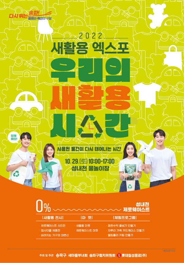 폐자원 문제와 분리수거 필요성을 담은 사진 전시 폐자원을 활용한 새활용 제품 소개 전시 가정에서 쓰지 않는 물품 교환 및 판매 장터 운영 천연수세미, 소창제품 등 제로웨이스트 마켓 폐현수막을 꼬아 만든 레츠고 줄넘기 체험 등이 주민들과 만난다.
